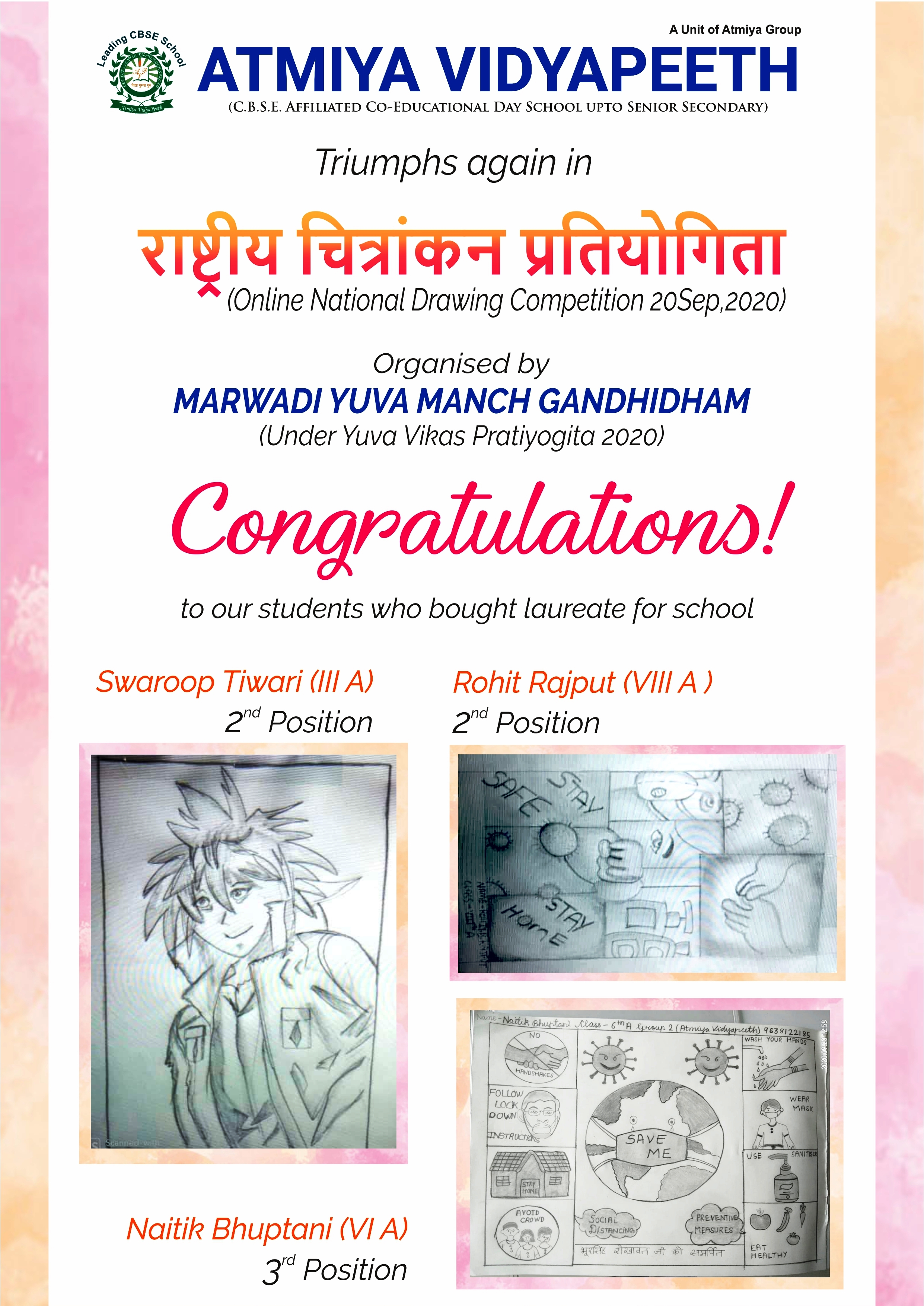 Atmiya Vidyapeeth had organized an Online Drawing & Poster Making Competition to provide an opportunity to all our students from Std III to XII to share their art and support other people going through the same situation. The objective of the competition was to win the hearts of people and to spread awareness and optimism in the minds of people. The Competition was headed and guided by our Art Faculty Mr.DhirenThanki.